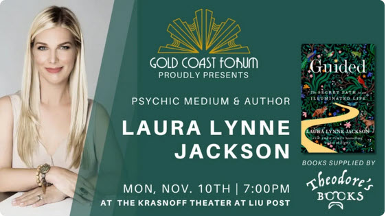 Gold Coast Forum presents an evening with psychic medium and author, Laura Lynne Jackson, as she discusses her new book, Guided: The Secret Path to an Illuminated Life! Following this event there will be an author signing with Laura Lynne Jackson.