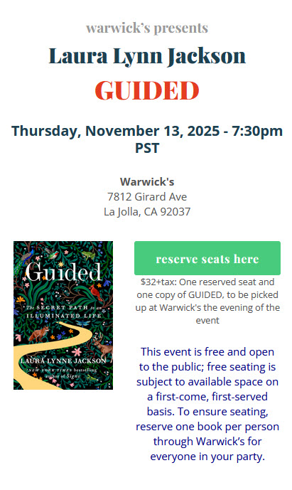 Reserved Seating is available when Guided is pre-ordered from Warwick’s through the linked green “Reserve Seats Here” button above. Only books purchased from Warwick’s will be signed. Please call the Warwick’s Book Dept. (858) 454-0347 for details.